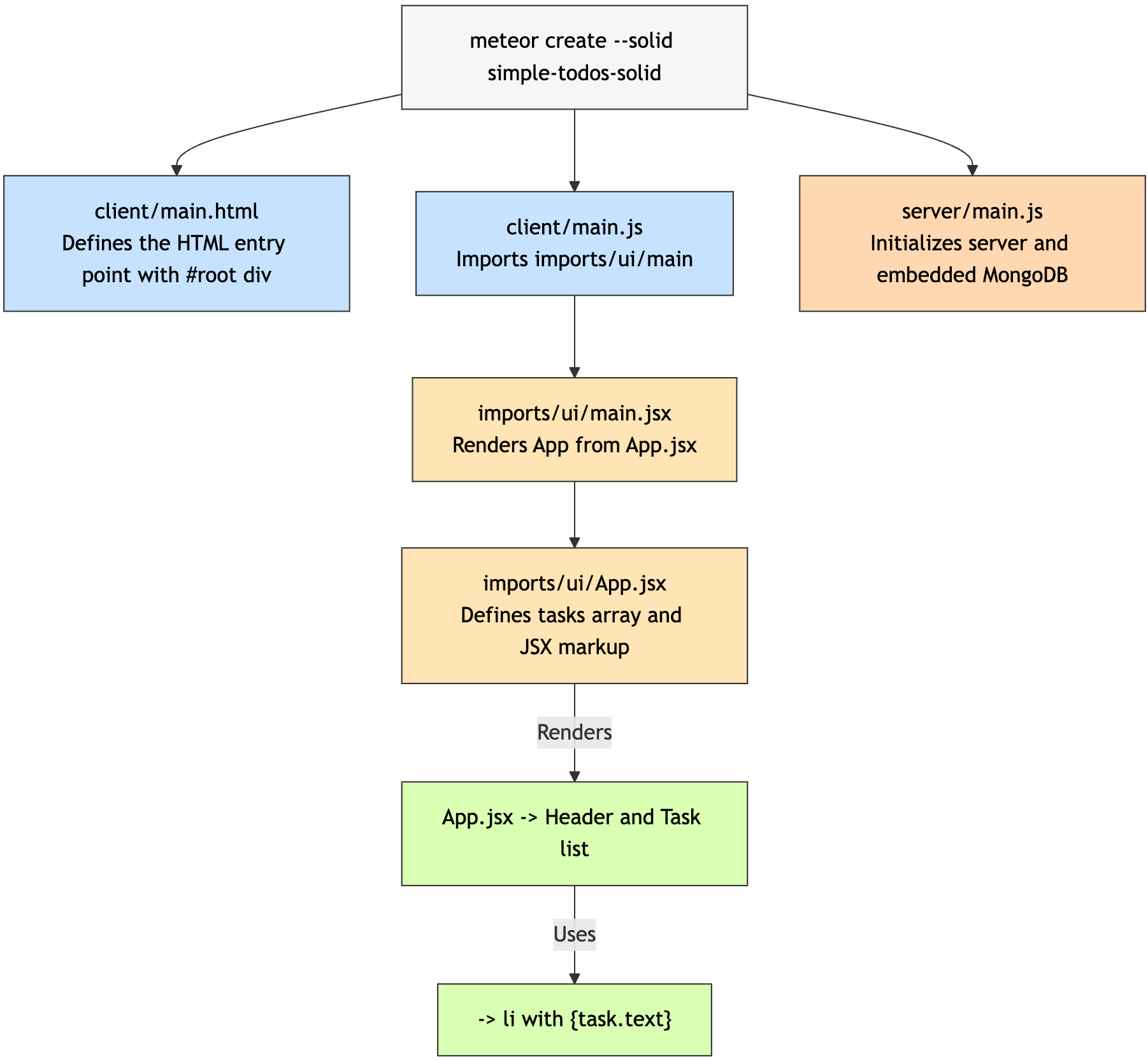 In Solid with Meteor, your main entry point is client/main.js, which imports imports/ui/main.jsx to render your root Solid component App.jsx to a target element in the HTML like <div id="root"></div> using Solid's render function.